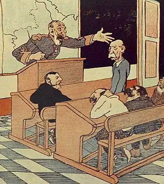 To this background, radical-right forces, having established in 1910 the Democratic Nationalist Party (PND), also began "strong electoral agitation."[3] They also demanded the extension of electoral rights, but wanted these limited to ethnic Romanian males.[20] Led by academics Nicolae Iorga and A. C. Cuza, this group negotiated an alliance with the PC, but later denounced it.[21] Their campaign was touched by significant controversy: Cuza was allegedly prevented by the authorities from running in Prahova,[22] then in Dorohoi, "with maneuvers unbecoming of a decent administration."[3] He eventually ran alongside Ion Zelea Codreanu in Baia County, where their electoral agents included the athlete-spy and future assassin Ilie Cătărău, whose impressive size struck fear in the electorate.[23]