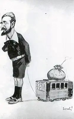 The Carp administration was soon hindered by political scandals such as the Gherasim Safirin affair, but alternating with displays of diplomatic success, as with the celebrated visit to Bucharest of Count Nogi.[43] By August, the newspaper headlines were about the "Tramcar Affair", an issue first brought up by Marghiloman and Dobrescu.[44] Government voted to dissolve the Bucharest Tramcar Society on suspicion that it functioned as part of the PNL political machine. When international experts found the Society to have been legally operating, the PNL and PCD instigated massive demonstrations against Carp.[45]