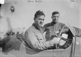 DePalma was present a fortnight later, in his Mercedes GP, at the next event at Maywood oval, Chicago. In a tight wheel-to-wheel battle he duelled with Resta for almost three hours until a sparkplug failed on his engine, giving Resta the win by two minutes.[5] DePalma won the next two rounds with Resta not racing though the British driver then won at the Omaha speedway in an event overshadowed by the death of Aldo Franchi's riding mechanic.[5] Johnnie Aitken then won four of the next six races to leap into title contention.[13]