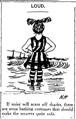 After the first fatality, newspaper cartoonists began using sharks as caricatures for political figures, German U-boats, Victorian morality and fashion, polio, and the deadly heat wave threatening the Northeast at the time. Fernicola notes, "Since 1916 was among the years that Americans were trying to break away from the rigidity and conservatism of the Victorian period, one comic depicted a risqué polka-dot bathing suit and advertised it as the secret weapon to keep sharks away from our swimmers." Another cartoon depicted "an exasperated individual at the end of a dock that displays a 'Danger: No Swimming' sign and mentions the three most emphasized 'danger' topics of the day: 'Infantile Paralysis (polio), Epidemic Heat Wave, and Sharks in the Ocean'." The cartoon is entitled "What's a Family Man to Do?"[64] With World War I ongoing in 1916 and America's growing distrust of Germany, cartoonists depicted U-boats with the mouth and fins of a shark assaulting Uncle Sam while he wades in the water.[65]