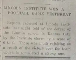 4. ^ "Lincoln Institute Wins Football Game". The Daily Capital News. Jefferson City, Missouri. October 19, 1919. p. 1. Retrieved September 25, 2024 – via Newspaperarchive.com Open access icon.