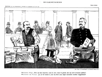 Ruijs de Beerenbrouck quickly realized that De Vries Czn could not remain. After discussing possible replacements with De Vries Czn, who subsequently resigned, Ruijs de Beerenbrouck approached Leonardus Trip and Gerard Vissering, who both declined. He then found a willing replacement in Christian historical Dirk Jan de Geer.[5] To replace Pop, Ruijs de Beerenbrouck offered the War and Navy ministries to Colijn on 8 July, but Colijn declined, citing his preference for a stronger defense policy and new elections to secure a right-wing majority. After Colijn's refusal, Ruijs de Beerenbrouck appointed anti-revolutionary Jannes van Dijk to the post.[6]