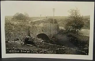 ![]() A 1925 postcard showing the wrecked coach at the base of Dibbles Bridge | |