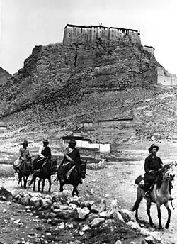 The descent was made to Chumbitang, and thence to Yatung, past the monastery at Khajuk, where the lama and monks were mystified as to why anyone would wish to climb Mount Everest.[26] The British trade agent in Yatung, Captain A. A. Russell, entertained members of the party, followed by a game of polo organised by Wood-Johnson. The entire expedition rendezvoused at Gautsa, where Ruttledge made Shebbeare "second-in-command".[27] Here the weather became much colder, with the party's first snows coming on the evening of 22 March. Moving past Phari Dzong on 25 March, a diversion over the Tang La from the normal route on account of snow was made in tremendous wind, dropping down to Shabra Shubra and then over the Dongka La and Chago La to Limbu, Tatsang and finally Kampa Dzong, reached on 29 March, from a pass above which the party had its first view of Mount Everest one hundred miles in the distance. At Kampa Dzong, which possessed "architectural beauty of the highest order", Ruttledge clad himself in mock formal dress – a Tibetan silk gown with a sheepskin lining and red girdle, topped by a collapsible opera-hat that had originally been brought along from England as a reward to the most successful porter – to meet the nyapala. Ruttledge commented: "The effect was all that could be desired. Here obviously was a man [himself] of standing in his own country. Deep called unto deep in the most friendly manner, with mutual respect; and our negotiations were completely successful." The nyapala invited the party to tour the dzong. The nearby grave of A. M. Kellas, the Scottish pioneer climber who had died in 1921 on his way to the first expedition to Mount Everest, had been disturbed and so expedition members dragged a fresh slab to cover the spot, re-cut the existing inscription, and performed a brief ceremony over it.[28] The advance stores had arrived at Kampa Dzong, as had the yaks and Longland, as quartermaster, set to organising them. The party departed on 2 April, passing Lingga and Mende on the way to Tengkye Dzong. Here a football match was staged, Boustead gave an exhibition of boxing and Longland put on a display of pole-vaulting using a bamboo pole (photographed by Smythe). Leaving the town on 5 April, the party travelled on to Khengu over the Bahman Dopté pass; at Khengu Lopsang Tsering fell off his pony and broke his collarbone; the anaesthetic administered by Greene stopped his heart, and only vigorous resuscitation, aided by coramine, saved his life.[29]