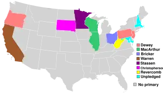 | Date | Primary | Douglas MacArthur | Earl Warren | John W. Bricker | Thomas Dewey | Harold Stassen | Wendell Willkie | Unpledged |