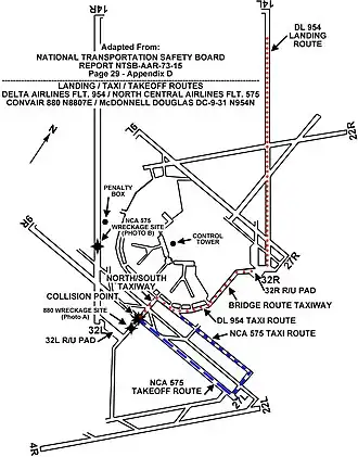 National Transportation Safety Board diagram from its accident report showing the paths of Delta Air Lines Flight 954 (dotted red line) and North Central Airlines Flight 575 (dashed blue line) at O'Hare International Airport in Chicago, Illinois, on December 20, 1972. The ground controller intended for Flight 954 to hold in the 32R run-up pad at right center, while Flight 954's flight crew intended to taxi to run-up pad 32L at lower left center via a route that intersected with Runway 27L. During its takeoff roll, North Central Flight 575 collided with Delta Flight 954 on Runway 27L at the point shown.
