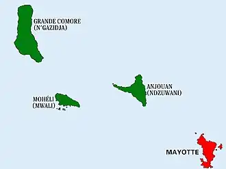 An independence referendum was held in the Comoros on 22 December 1974. The overall result was a strong "yes" vote, with 94.57% of voters voting for independence and almost all the "no" votes being cast in Mayotte, where there was a majority for remaining under French control.[1] In contrast, on Mohéli only five out of 6,059 votes were against independence. Voter turnout was 93.3%.[2]