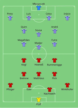 Porto won its first European trophy after fighting back from 1–0 down, with the goals coming from a back heel by Rabah Madjer and a volley from Juary, after a Ludwig Kögl header had given Bayern the lead in the first half. This was the first European Cup final that Bayern, and their captain Lothar Matthäus, would lose to successive late goals, repeated 12 years later in the 1999 UEFA Champions League final against Manchester United.[1]