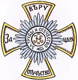The regiment had a banner that dated back to 1800, which earlier belonged to Count Liven's 1st Regiment of the Moscow Inspectorate.[1] In 1913 it was given a new insignia which included a cross.[4] It was one of the four Russian regiments that went to war in 1914 with its banner, which dated back to the times of Paul I.[2]