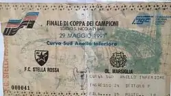 The 1991 European Cup final was a football match held at the Stadio San Nicola in Bari, Italy, on 29 May 1991, that saw Red Star Belgrade of Yugoslavia[a] defeat Marseille of France in a penalty shoot-out. After normal time and extra time could not separate the two sides, the match was to be decided on penalty kicks. Manuel Amoros's miss for the French side proved crucial, as Red Star held their nerve to win their first European Cup title. As of 2025, this remains the last European Cup final that both clubs were making their debut appearances in the competition's final.