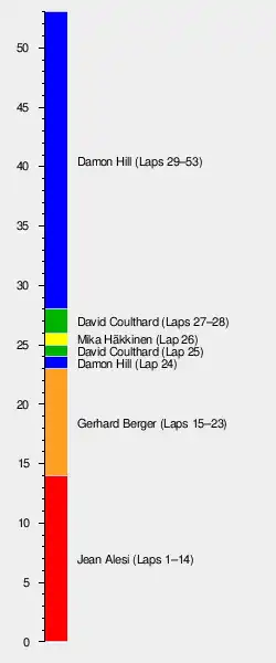 The 53-lap race was won by British driver Damon Hill, driving a Williams-Renault, with Austria's Gerhard Berger second in a Ferrari and Finland's Mika Häkkinen third in a McLaren-Peugeot. Frenchman Jean Alesi took pole position in the other Ferrari and led before suffering a gearbox failure on lap 15.