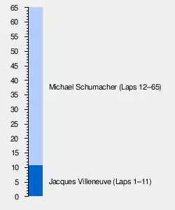 Damon Hill had started the race from pole position, but dropped to 8th after spinning twice in the opening laps, before another spin into the pit wall on lap 12 ended his race. Schumacher recovered from a poor start to take the lead from Villeneuve on lap 13, and from then on he dominated the race, lapping over three seconds a lap faster than the remainder of the field.[3][4]
