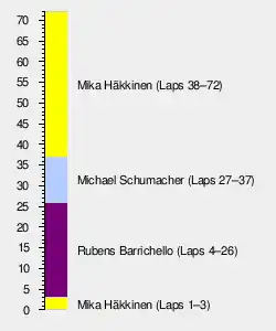 Michael Schumacher came in for a pit stop on lap 38, allowing Mika Häkkinen past. Häkkinen had been held up by Schumacher, so he began trying to build up enough of a gap so he could come out ahead of Schumacher after his own pit stop. Lapped traffic delayed his progress at first, but after one lap he was able to turn in a couple of fast laps. He pitted on lap 42, and his fast laps combined with quick work by his pit crew allowed him to easily retain the lead over Schumacher.[4]