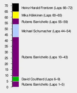 David Coulthard suffered a complete electrical failure (alternator failure) on lap 10 and retired, giving the lead back to Rubens Barrichello.[13] Mika Häkkinen caught Heinz-Harald Frentzen on lap 12, then hounded him for three laps before passing him in a repeat of the move he had pulled on Michael Schumacher earlier.[11] Frentzen tried to fight back, and was able to pull alongside Häkkinen, but Häkkinen's inside line through turn six cemented his position. Behind in the midfield Irvine overtook another car. This time it was Alexander Wurz in the Benetton. On Lap 16 Häkkinen caught up with Jean Alesi quickly, but was stuck behind him for several more laps. Häkkinen used the slipstream to pull alongside Alesi on lap 19, but they both locked up into Adelaide and only barely made the corner.[11] Häkkinen was able to stay ahead, and began to chase down Barrichello, four and a half seconds ahead.