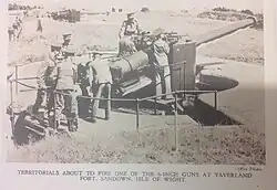 On the outbreak of war the regiment and its three batteries mobilised in the Portsmouth Defences.[60] Together with Princess Beatrice's (Isle of Wight Rifles) Heavy Rgt, it was responsible for manning 6 × 9.2-inch, 16 × 6-inch and 8 × 12-pounder guns.[61]