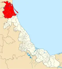Veracruz lost a congressional district in the 2023 districting plan adopted by the National Electoral Institute (INE), which is to be used for the 2024, 2027 and 2030 elections.[8] The reconfigured 1st district covers 355 electoral precincts (secciones electorales) across 15 municipalities in the Huasteca Alta region in the extreme north of the state:[9][10]