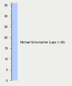 On the lap, after Verstappen hit him, Heidfeld attempted to pass de la Rosa on the left at the La Source hairpin. The two made contact with Heidfeld retiring immediately with front wing and suspension damage. De la Rosa entered the pit lane the lap after with car damage.[41][45] Up front, Michael Schumacher began to pull away from the rest of the field, increasing his lead over Fisichella to five seconds by the third lap.[42] One lap prior, Montoya's car pulled to one side though he overtook four cars before he retired from an engine failure.[39][41] On lap three, Trulli overtook Button for sixth. Button lost seventh to Alesi on the following lap. Michael Schumacher further extended his advantage to 14 seconds over Fisichella by lap six as Coulthard challenged the Benetton. Further back, Villeneuve passed Button for eighth. The first round of pit stops began at the conclusion of the lap when Trulli entered the pit lane. After his pit stop on lap seven, Panis crossed the white line to denote the pit lane exit, an infraction of the sporting regulations which entailed a ten-second stop-and-go penalty.[42]