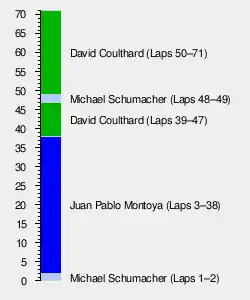 Häkkinen's car was removed from the track by the end of the second lap, and the safety car was withdrawn.[78][79][80] With limited distance to accelerate between the pit lane and the start/finish line, Montoya on cold tyres remained close behind Michael Schumacher.[74][81] He used his more powerful engine to aggressively overtake Schumacher on the unclean inside line by braking later at the Senna S chicane for the race lead.[14][67] Both drivers made contact and Montoya drove Michael Schumacher wide right onto the grass in the middle of the turn to take the lead into the Curva do Sol corner.[67][72][78] On the second straight,[74] Barrichello missed his braking point and collided with the rear of Ralf Schumacher's car, which had been pushed off the track by Trulli but had driven back to the right into Descida de Lago corner, removing Barrichello's front-left wheel and front wing, as well as Ralf Schumacher's rear wing.[72][77][78] Barrichello spun out in the gravel trap and retired while Ralf Schumacher went to the pits for extensive rear-end repairs and fell four laps behind.[73][82]
