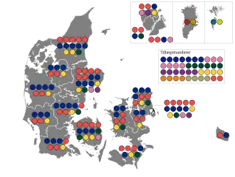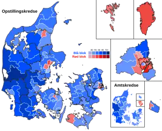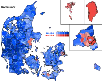 The coalition relied on the votes of other right-wing parties such as the Danish People's Party, which polled better than ever before. Voter turnout was 87.1% in Denmark proper, 80.0% in the Faroe Islands and 61.5% in Greenland.[2] The Venstre led coalition government would last until the 2011 election, lasting through two intermediate elections.