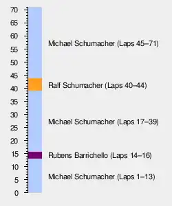 Montoya returned to the top ten on lap 30 by overtaking De La Rosa for tenth, and the following lap he passed Irvine on the start/finish straight for ninth.[70][80] However, he was lapping slower than teammate Ralf Schumacher, who was gradually gaining on Michael Schumacher as his Michelin tyres began to outperform the Ferrari's Bridgestones. This was until Michael Schumacher gradually pulled away from Ralf Schumacher midway through the race with a string of consecutive fastest laps.[72][74] On lap 39, Räikkönen passed Button for fifth on the inside at the end of the start/finish straight.[70][72] Michael Schumacher led by eight seconds when he made his solitary pit stop for fuel and to clear debris from a radiator duct on that lap. Ralf Schumacher took the race lead after his brother's 12.6-second stop.[70][71][82] Montoya overtook Heidfeld for seventh on lap 42.[70]