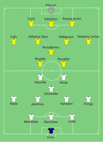 With the exception of the suspended Ballack, who was replaced by Jens Jeremies, the remainder of the team that started the semi-final against South Korea were available and selected for the final.[34][35][36] For Brazil, Ronaldinho returned to the team following his suspension in the semi-final. He replaced Edílson, whom BBC Sport described as having been a "poor replacement" for Ronaldinho and "almost anonymous throughout".[37] Brazil's team was otherwise unchanged from the team which beat Turkey.[35][38]