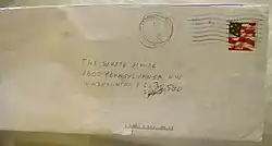 On November 6, 2003, another letter, described as "nearly identical" to the October letter, was discovered. This time, the letter was addressed to The White House and it was discovered at a White House mail-processing facility in Washington, D.C.[11] The letter contained a small vial of a white powdery substance that was initially tested negative for ricin.[12] After subsequent testing at the mail facility resulted in positives for ricin contamination on mail equipment, the U.S. Secret Service ordered a retest that showed by November 10 the letter was "probable for ricin".[12]