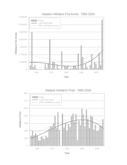 Graphs record the area burned and number of wildfires in Alaska from 1956 to 2004.