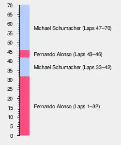 Schumacher stopped for a second time on lap 28 and then set a series of fastest laps, which led to Alonso falling behind him after his stop four laps later. Another stop by the Ferrari on lap 42 was a sign of low fuel levels, which explained his superior pace. After Alonso made his third and final stop on lap 45, he rejoined in second place but never managed to match Schumacher's lap times. The gap had opened up to over 20 seconds by lap 57, when the World Champion pitted for a fourth time and returned to the track, still seven seconds ahead of his nearest rival. Schumacher scored his ninth win of the season.[2]