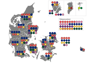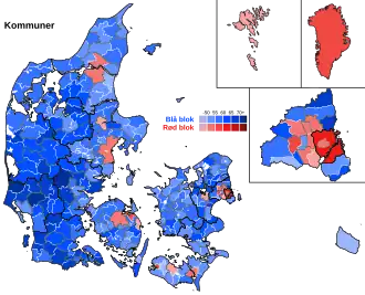 General elections were held in Denmark on 8 February 2005.[1] Prime Minister Anders Fogh Rasmussen's Venstre remained the largest party in the Folketing and his governing coalition with the Conservative People's Party remained intact, with the Danish People's Party providing the parliamentary support needed for the minority government. The Danish Social Liberal Party made the biggest gains of any party, although it remained outside the governing group of parties. The elections marked the second time in a row that the Social Democrats were not the largest party in parliament, a change from most of the 20th century. The Social Democrats lost five seats and leader Mogens Lykketoft resigned immediately after the elections. Voter turnout was 85% in Denmark proper, 73% in the Faroe Islands and 59% in Greenland.[2]