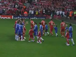 In October 2007, Arsenal equalled the UEFA Champions League record victory with a 7–0 win over Slavia Prague at the Emirates Stadium.[1] The record was broken the following month when Liverpool defeated Beşiktaş 8–0 at Anfield.[2] All four English clubs competing in the Champions League reached the quarter-finals, resulting in three all-English ties during the competition's latter stages. Liverpool eliminated Arsenal in the quarter-finals, but lost the semi-final to Chelsea, who went on to meet Manchester United in the final in Moscow. United completed the European Double, winning the Premier League two points ahead of Chelsea and winning the UEFA Champions League, again against Chelsea 6–5 on penalties (1–1 after extra time) to lift the European Cup for the third time. This was a unique occurrence – the first time two English clubs had met in the final of the European Cup/Champions League. It was also a repeat of the opening game of the season, the FA Community Shield, which also finished in a 1–1 draw and saw a United win 3–0 on penalties.