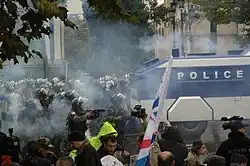 In 2007, a series of anti-government protests took place across Georgia. The demonstrations peaked on 2 November 2007, when 40,000–50,000[1] people rallied in downtown Tbilisi, the capital of Georgia.[2] People protested against the allegedly corrupt government of president Mikheil Saakashvili. Protests triggered by detention of Georgian politician Irakli Okruashvili on charges of extortion, money laundering, and abuse of office during his tenure as defense minister of the country[3] were organized by the National Council, an ad hoc coalition of ten opposition parties, and financed by the media tycoon Badri Patarkatsishvili.[4] Demonstrations occurred both in September and November 2007 and were initially largely peaceful. The protests went downhill by 6 November 2007, but turned violent the next day when the police, using heavy-handed tactics, including tear gas and water cannon, unblocked Rustaveli Avenue, Tbilisi's main boulevard, dislodged the protesters from the territory adjoining to the House of Parliament, and prevented the demonstrators from resuming the protests. The government accused the Russian secret services of being involved in an attempted coup d'état and declared a nationwide state of emergency later that day which lasted until 16 November 2007.