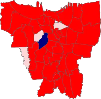 ![]() Results by district. Districts won by Fauzi Bowo are in red, while the ones won by Adang Daradjatun are in blue. Lighter shades (■ or ■) indicate a winning majority of less than 5%. | |||||||||||||||||||
