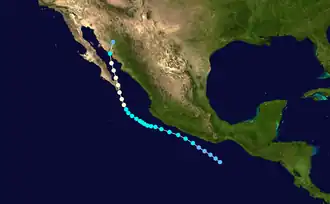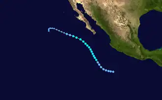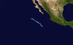 On May 24, a tropical wave emerged off the western coast of Africa. The wave entered the eastern Pacific around June 6 and shower and thunderstorm activity began to increase shortly thereafter. A broad area of low pressure formed a few hundred miles south of Acapulco, Mexico two days later.[19] Following satellite evidence of a well-defined circulation and organized convective activity,[20] the National Hurricane Center upgraded the disturbance to a tropical depression at 1200 UTC on June 11. After attaining winds of 35 mph (56 km/h) and a minimum barometric pressure of 1004 mbar (1004 hPa; 29.6 inHg), the depression began to traverse cooler waters and much more stable air. This caused all associated convection to fade away, and the depression degenerated to a non-convective remnant low at 0000 UTC on June 13. The remnant low continued northwest until dissipation by 0600 UTC on June 15.[19]
