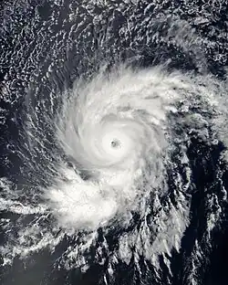 A tropical wave emerged off the western coast of Africa on June 27 and tracked westward to reach the eastern Pacific on July 8. Initially embedded within the ITCZ, development was slow until the system's convection increased on July 13. A day later, the NHC classified it as Tropical Depression Six-E about midway between Mexico and Hawaii. Although wind shear was light, ocean temperatures were marginal for intensification, and the depression intensified into Tropical Storm Cosme on July 15, while moving generally northwestward.[25][26] Following the development of a curved convection band and appearance of an eye on satellite,[27] Cosme was upgraded to a Category 1 hurricane at 1800 UTC the next day, about 1,600 mi (2,600 km) east of Hilo, Hawaii; it is at this time that the hurricane attained its peak with winds of 75 mph (121 km/h) and a minimum barometric pressure of 987 mbar (987 hPa; 29.1 inHg). Cosme tracked westward over cooler waters, causing the system to weaken quickly back to tropical storm strength. At 1800 UTC on July 18, Cosme weakened to a tropical depression after crossing into the central Pacific.[25] Gradually weakening, Tropical Depression Cosme passed south of the Hawaiian Islands on July 20 with a minimum central pressure of 1010 mbar.[28] By late on July 22, Cosme degenerated into a remnant low near Johnston Island. The circulation dissipated three days later.[29][25]