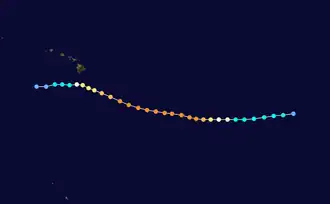 An ill-defined tropical wave entered the eastern Pacific on August 1 and steadily organized to attain tropical depression intensity eight days later. Within an environment of light shear, the depression intensified into Tropical Storm Flossie at 0000 UTC on August 9 and continued to organize to attain Category 1 hurricane intensity by 1200 UTC the following day as an eye became apparent on satellite. Continuing westward and crossing into the central Pacific basin, the system began a period of rapid intensification that brought it to its peak intensity with winds of 140 mph (230 km/h) and a minimum barometric pressure of 949 mbar (949 hPa; 28.0 inHg) at 0000 UTC on September 12, while positioned roughly 980 mi (1,580 km) east-southeast of the Big Island. Increased wind shear the next day caused Flossie to begin a slow weakening trend thereafter; at 1200 UTC on September 14, the system weakened to a Category 2 hurricane, and by 0600 UTC on September 15, the cyclone was barely a Category 1 hurricane. Six hours later, it weakened to a tropical storm as the low-level center became exposed on satellite. Flossie weakened to a tropical depression early on September 16 and dissipated by 1800 UTC.[47]