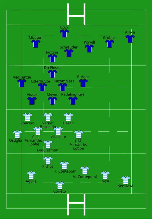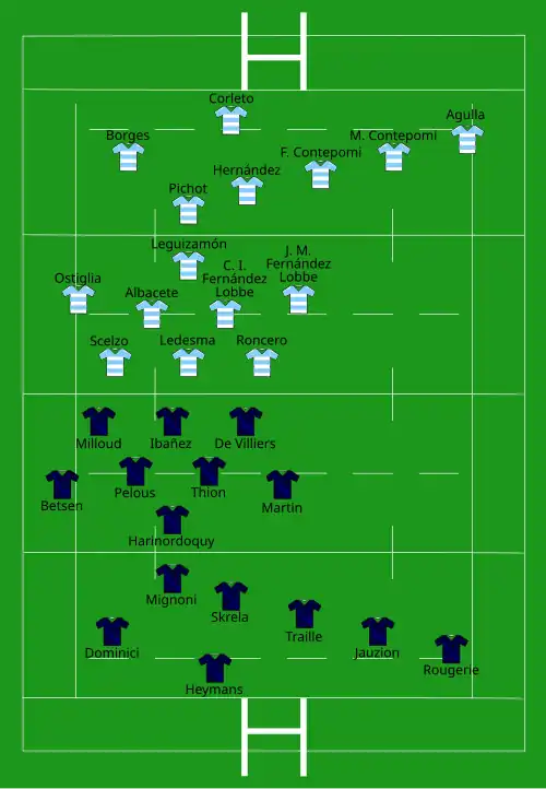 • This was the third consecutive World Cup in which Argentina played the tournament host in the competition's opening match. In 1999, the Pumas lost 23–18 to Wales and in 2003 lost 24–8 to Australia.