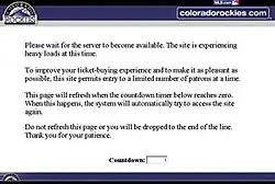 On October 17, 2007, a week before the first game of the World Series, the Colorado Rockies announced that tickets would be made available to the general public via online sales only, despite prior arrangements to sell the tickets at local retail outlets.[5] Five days later, California-based ticket vendor Paciolan, Inc., the sole contractor authorized by the Colorado Rockies to distribute tickets, was forced to suspend sales after less than an hour due to an exorbitant number of purchase attempts.[6]