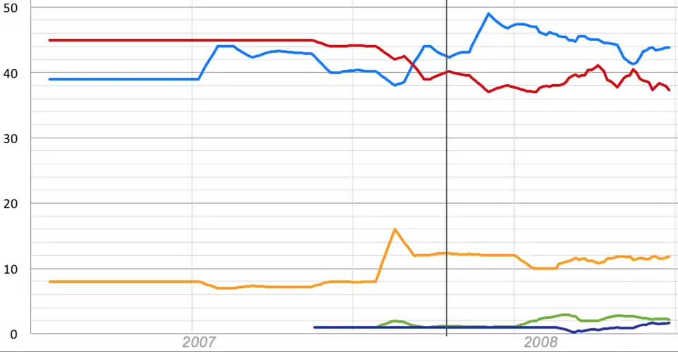 | 11/04/08 | YouGov Archived 28 December 2016 at the Wayback Machine | 39% | 45% | 12% | 1% | 2% | 1% | 0% | 46% | 54% |