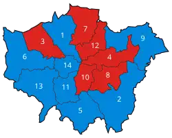 ![]() First preference votes by London borough. Blue boroughs are those with most first preference votes for Boris Johnson and red those for Ken Livingstone | |||||||||||||||||||||||||||||||||||||