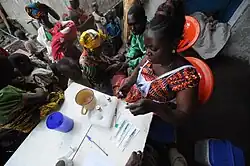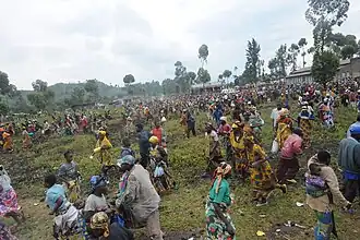 On November 26, 2008, rebel forces engaged Mai-Mai militia near the towns of Kinyando and Kwwenda despite the ceasefire, sending civilians "fleeing along highways". The UN condemned this breach of the ceasefire while calling on the Congolese government to discipline government troops, who were caught looting the village of Bulotwa.[59] Meanwhile, a crowd of 100,000 displaced persons gathered in the rebel-held town of Rutshuru, where the United Nations were distributing supplies and medicine, intended to help combat cholera, which was reported to be affecting hundreds of people, having spread through unsanitary refugee camps.[60]