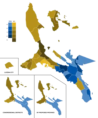 As required by law, the COMELEC held a plebiscite on December 13, 2008, 60 days after Republic Act No. 9495 took effect. Governor Rafael Nantes, one of the original authors of the law, and Vice Governor Kelly Portes opposed the division of the province. Quezon Provincial Board member Sonny Pulgar and businessman Hobart Dator Jr. launched the "Save Quezon Province Movement." The Comelec allotted 50 million for the plebiscite.[2] Academician Prof. Joseph Jadway "JJ" Marasigan provided what he called the "strong theoretical framework" that deemed the said split as a step backward. He instead called for the professionalization of service institutions and the differentiation of functions as the answer to the province's increasingly becoming complex environment. He organized students and fellow academicians to oppose such move. His participation resulted in a grave misunderstanding with Lucena Catholic Bishop Emilio Marquez who strongly supported the idea of splitting the province. Marasigan maintained that bishops have no business in dealing with entirely political matters and should refrain from using their influence over their flock. Nantes later softened his stand against the proposed creation of Quezon del Sur.[3] Accordingly, upon request of Comelec Chair Jose Melo, a ₱38 million "Special Allotment Release Order" was issued by the Department of Budget and Management to the Commission on Elections (Philippines) to fund the holding of the plebiscite.[4]