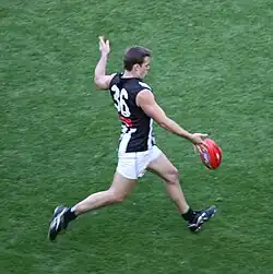 St Kilda dominated in the first half of the second quarter, with a first score registered 33 seconds after the bounce. However, they could not put pressure on the scoreboard, kicking five behinds in the first fourteen minutes of the quarter—three of which were scored by Sam Gilbert while on the run—to take St Kilda's total score to only 0.7 (7), while Alan Didak scored a goal for Collingwood from the goal square in the 6th minute.[30] Brendon Goddard finally scored St Kilda's first goal in the 15th minute from a 20-metre set shot. After missing two difficult shots at goal in the 17th and 18th minutes, Collingwood goaled twice in the space of one minute, through Macaffer and Darren Jolly.[30] The end of the quarter was filled with physical one-on-one contests with Collingwood willing to play for time, and no more goals were scored in the quarter. Two more opportunities for Collingwood ended up behinds but kept the pressure on St Kilda. Finally, Adam Schneider had a set shot from 30m as the siren sounded, but only managed a behind. In general play, the second quarter was fairly even, with St Kilda winning the inside-50s 13–10, but while none of their missed opportunities were easy shots, the Saints' inability to convert the chances they had contributed to their increasing deficit. Collingwood won the quarter 3.3 (21) to St Kilda's 1.6 (12) and took a 27-point lead into half time.[28]
