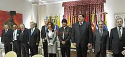 UNASUR Member States presidents and representatives at the Buenos Aires emergency summit. Juan Manuel Santos (Colombia) and Hugo Chávez (Venezuela) were in flight to Buenos Aires, and arrived hours later.