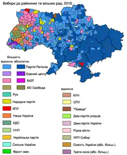 The 2010 Ukrainian local elections took place on 31 October 2010,[1] two years before the 2012 general election. The voter turnout across Ukraine was about 50%, which is considered low in comparison to previous elections.[2]