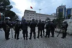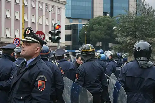 According to police and the international media, an estimated 20,000 people attended an anti-government demonstration in Tirana,[12] but the opposition claimed there were about 200,000 demonstrators. The large number of police coupled with continuous provocations and rising political tensions during the week preceding the demonstration, were major factors in the development of the protest. Anti-government chants were followed by clashes with a group of around 600 protesters who threw umbrellas at the riot police. When a group of 600 protesters started throwing stones and Molotov cocktails[13] the police reacted using tear gas and batons.[14]