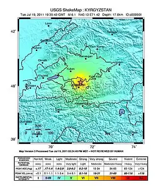 - ^ "PAGER – M 6.1 – KYRGYZSTAN". Prompt Assessment of Global Earthquakes for Response (PAGER). United States Geological Survey. Archived from the original on July 22, 2011. Retrieved 2011-07-20.