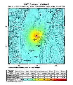 The 2012 Shwebo earthquake occurred at 07:42 local time (01:12 UTC) on 11 November in Myanmar. It had a magnitude of 6.8 on the moment magnitude scale and a maximum perceived intensity of VIII (Severe) on the Mercalli intensity scale.[2] The epicenter was near the town of Male, 52 km NNE of the city of Shwebo, 64 km west of Mogok and 120 km north of Mandalay. Significant damage and possible casualties have been reported from near the epicenter, with up to 26 people dead and many more injured. Part of a bridge under construction fell into the Irrawaddy River near Shwebo and a gold mine collapsed at Sintku.[3] [4] An aftershock with a magnitude of 5.8 followed at 17:24 local time (10:54 UTC).[5]