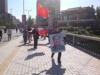 The anti-Japanese protests were occasionally exploited by protesters who sought to criticize the Chinese government. Such demonstrations included marching with posters of the late Chinese leader Mao Zedong—perceived to be more assertive on issues of sovereignty than current leaders, as well as signs about corruption, food safety, and income inequality.[21] Supporters of the ousted anti-capitalist leader Bo Xilai also had a showing during the protests.[22]