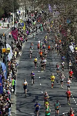 The 2013 London Marathon began with a 30-second moment of silence in honour of the victims of the Boston Marathon bombings.[8] Many runners also wore black ribbons on the encouragement of race organisers.[7] Organisers also pledged to donate US$3 to a fund for Boston Marathon victims for every person who finished the race.[9] The weather was ideal for racing, drawing 700,000 fans and raising the prospect of a world record time.[7][9]