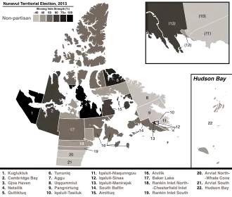 ![]() Popular vote by riding. As Nunavut elections are on a non-partisan basis, all candidate run as independents. The Kugluktuk and Netsilik ridings (black) were elected by acclamation. | |||